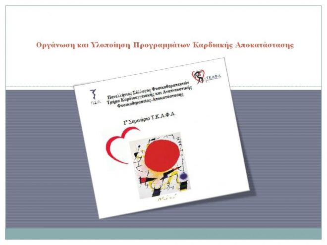 Συγκεκριμένα το Τμήμα Καρδιοαγγειακής και Αναπνευστικής Φυσικοθεραπείας-Αποκατάστασης (ΤΚΑΦΑ) του Πανελληνίου Συλλόγου Φυσικοθεραπευτών (ΠΣΦ) θα πραγματοποιήσει Σεμινάριο Καρδιοαγγειακής Φυσικοθεραπείας και Αποκατάστασης το Σάββατο 7 Μαρτίου 2015 στο Ωνάσειο Καρδιοχειρουργικό Κέντρο. Σκοπός του Σεμιναρίου είναι η ενημέρωση και εκπαίδευση στην Οργάνωση και Υλοποίηση Προγραμμάτων Καρδιακής Αποκατάστασης με στόχο την ανάπτυξη τέτοιων προγραμμάτων στην Ελλάδα. Επιστημονικές μελέτες δείχνουν ότι τα Προγράμματα αυτά συμβάλλουν σημαντικά στη βελτίωση της ποιότητας ζωής και στη μείωση της νοσηρότητας και θνητότητας ασθενών με καρδιοαγγειακά νοσήματα. Το Σεμινάριο απευθύνεται εκτός από Φυσικοθεραπευτές, σε Ιατρούς Καρδιολόγους και γενικά στους επιστήμονες εκείνους που ασχολούνται με την αποκατάσταση καρδιοπαθών, όπως Διατροφολόγους και Ψυχολόγους. (Πατήστε εδώ για πληροφορίες) ή δείτε αναλυτικά παρακάτω στα download attachments ολόκληρο το πρόγραμμα του σεμιναρίου.Το Σεμινάριο μοριοδοτείται με μόρια συνεχιζόμενης Ιατρικής Εκπαίδευσης που αναγνωρίζονται απο τον Πανελλήνιο Ιατρικό Σύλλογο και το EACCME-UEMS