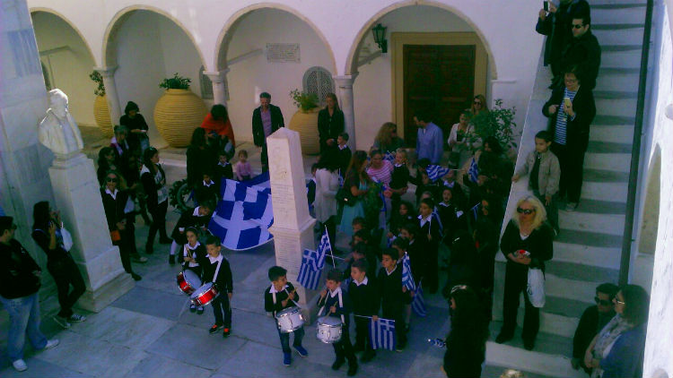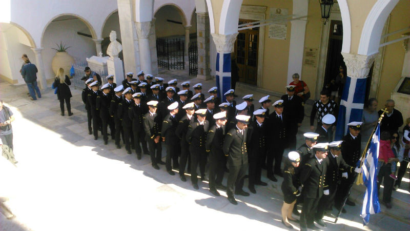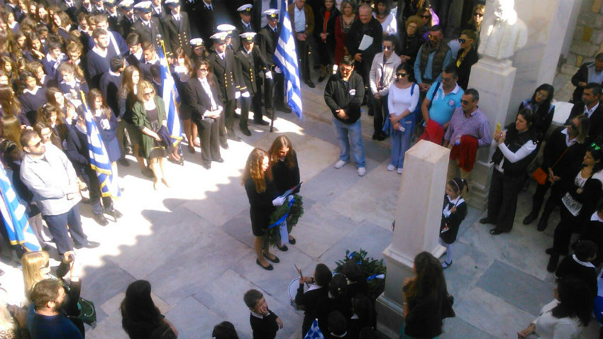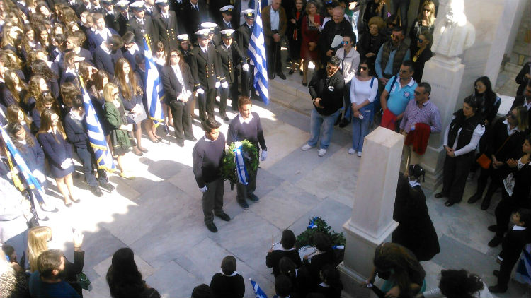 Σήμερα το πρωί πραγματοποιήθηκε στην Ύδρα στο πλαίσιο του εορτασμού της εθνικής μας επετείου της 28ης Οκτωβρίου, κατάθεση στεφάνων από τους μαθητές των σχολείων και τους σπουδαστές της Ακαδημίας Εμπορικού Ναυτικού στο Ηρώο των Πεσόντων στο προαύλιο του Ι. Καθεδρικού Ναού.