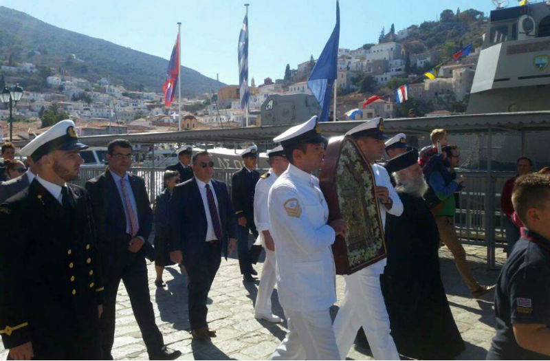 Στον Πειραιά και τον Ι. Ναό Αγίου Δημητρίου μετέφερε την εικόνα ο Γενικός Αρχιερατικός Επίτροπος και Προϊστάμενος του Ι. Καθεδρικού Ναού, Πρωτ. Ακίνδυνος Δαρδανός συνοδευόμενος από τον εκπρόσωπο της Ι.Μ. Πειραιά Αρχιμ. π. Πολύκαρπο Μπόγρη και τον Δήμαρχο Ύδρας, Γιώργο Κουκουδάκη.