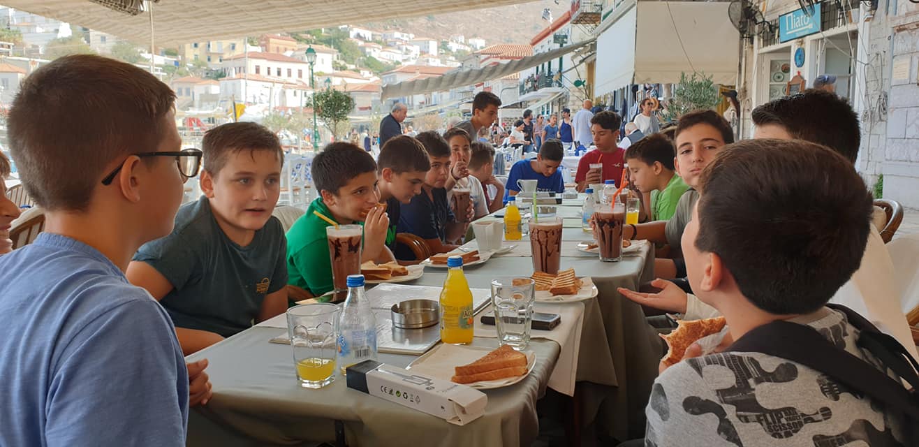 Τα νεαρά αγόρια μετά την ανάπτυξη επίκαιρου θέματος που συζήτησαν με τον Γενικό Αρχιερατικό Επίτροπο της Μητρόπολης, Πρωτ. Ακίνδυνο Δαρδανό, που έχει την εποπτεία και καθοδήγησή τους, μεταφέρθηκαν για κέρασμα σε καφετέρια της Ύδρας.