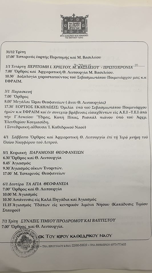 Το πρόγραμμα από την Τρίτη 31/12/2019 έως την Τρίτη 7 Ιανουαρίου 2020 στον Ιερό Καθεδρικό Ναό Κοιμήσεως Θεοτόκου Ύδρας.