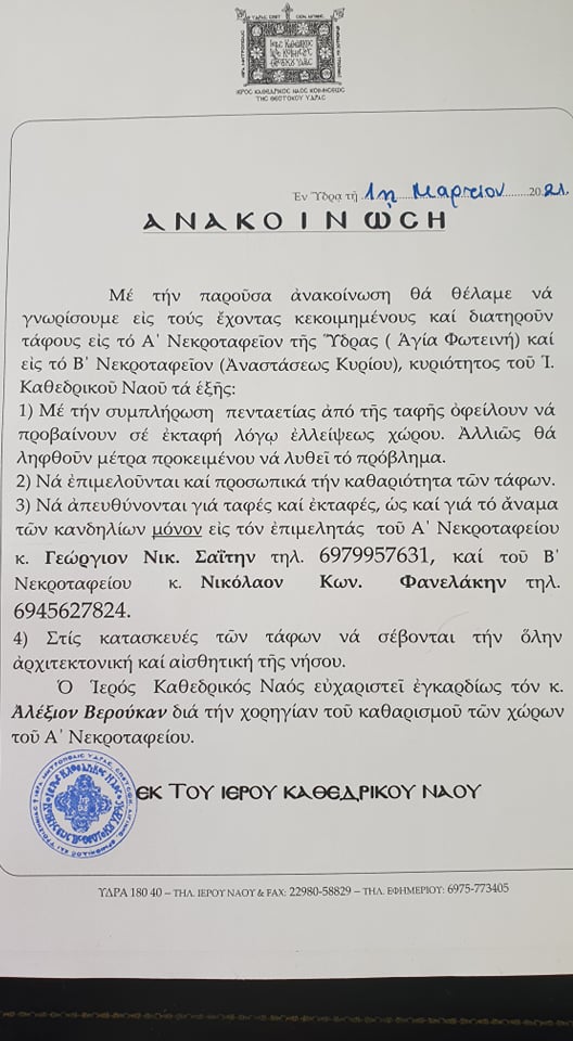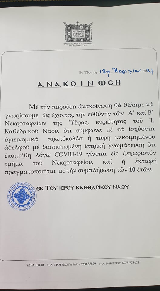 Από τον Ιερό Καθεδρικό Ναό της Ύδρας γίνεται ενημέρωση προς τους πολίτες σχετικά με τις ταφές και εκταφές αλλά και το άναμμα των καντηλιών στο Α' Νεκροταφείο (Αγία Φωτεινή) και το Β΄Νεκροταφείο (Αναστάσεως Κυρίου) κυρίοτητος του Ναού καθώς και για την ταφή κεκοιμημένου με διαπιστωμένη ιατρική γνωμάτευση Covid-19.