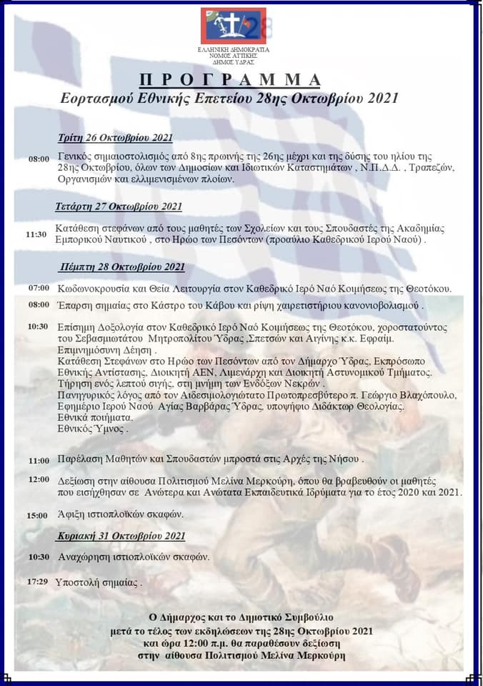 Το πρόγραμμα του εορτασμού της Εθνικής Επετείου της 28ης Οκτωβρίου στην Ύδρα