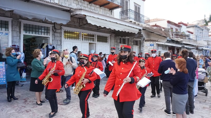 Με τη λήξη, πλήθος κόσμου αποχώρησε από τον προαύλιο χώρο της Μητρόπολης και μεταφέρθηκε στην παραλία όπου παρακολούθησε και χειροκρότησε με ενθουσιασμό την όμορφη παρέλαση των μαθητών των σχολείων, του Μουσικού Συλλόγου Ύδρας και των σπουδαστών της ΑΕΝ.