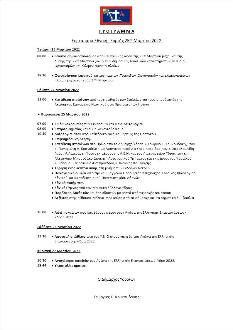 Το πρόγραμμα  του εορτασμού της εθνικής επετείου της 25ης Μαρτίου από τον Δήμο Ύδρας