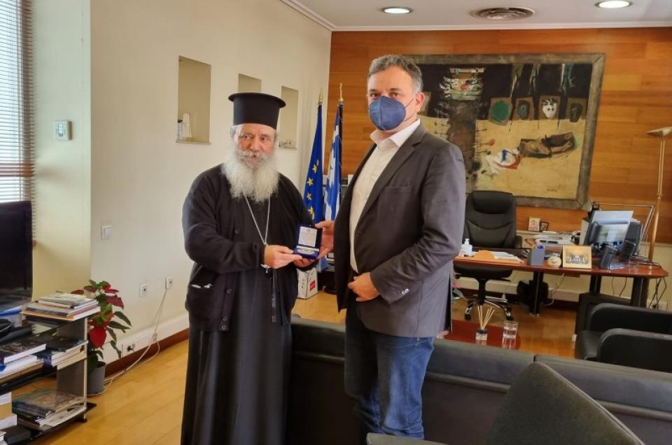 Ο Σεβασμιώτατος Ποιμενάρχης ημών κ.κ. ΕΦΡΑΙΜ την Τετάρτη 13η Απριλίου 2022, συνοδευόμενος υπό του Πανοσ. Πρωτοσυγκέλλου Αρχιμ.π. Νεκταρίου Δαρδανού, του Γενικού Αρχιερατικού Επιτρόπου πρωτ. π. Ακινδύνου Δαρδανού και του κ. Π. Θεοφιλάκου Συντηρητού, επισκέφθηκε τον Αξιότιμο Γενικό Γραμματέα του Υπουργείου Πολιτισμού και Αθλητισμού κ. Γεώργιο Διδασκάλου.