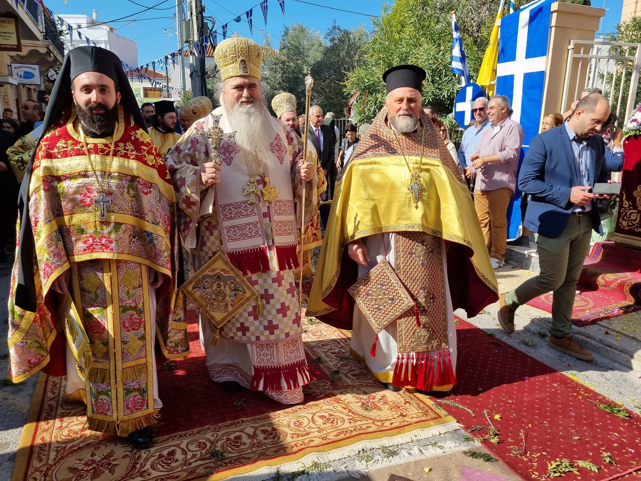 Μετά την πολυαρχιερατική Θ.Λειτουργία τελέσθηκε Δοξολογία και ο Σεβασμιώτατος Ποιμενάρχης μας ευχαρίστησε τους Σεβασμιωτάτους Αρχιερείς τους Ιερείς όλους τους πολιτικούς, Υπουργό Ναυτιλίας κ. Κώστα Κατσαφάδο, τους Βουλευτές, τον Δήμαρχο Αιγίνης, το Δημοτικό Συμβούλιο και όλες τις αρχές της Νήσου, Σχολεία κλπ.