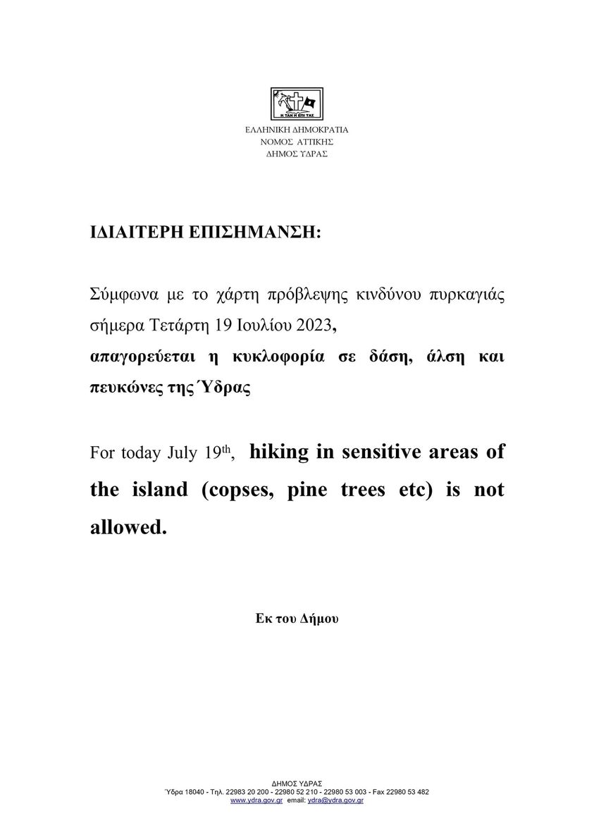 Ανακοίνωση για απαγόρευση της κυκλοφορίας σε δάση, άλση και πευκώνες σήμερα Τετάρτη 19 Ιουλίου εξέδωσε ο Δήμος Ύδρας.