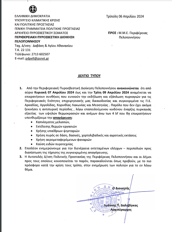 Λάβαμε από το Εθελοντικό Πυροσβεστικό Κλιμάκιο Ύδρας και δημοσιεύουμε δελτίο τύπου από το Υπουργείο Προστασίας του Πολίτη, Αρχηγείο Πυροσβεστικού Σώματος, σχετικά με τις συνθήκες που ευνοούν την εκδήλωση και εξάπλωση πυρκαγιών εξαιτίας των υψηλών θερμοκρασιών και ανέμων άνω των 4bf που θα επικρατήσουν από την Κυριακή 7 Απριλίου έως και την Τρίτη 9 Απριλίου και την απαγόρευση ορισμένων δραστηριοτήτων όπως περιγράφονται παρακάτω: