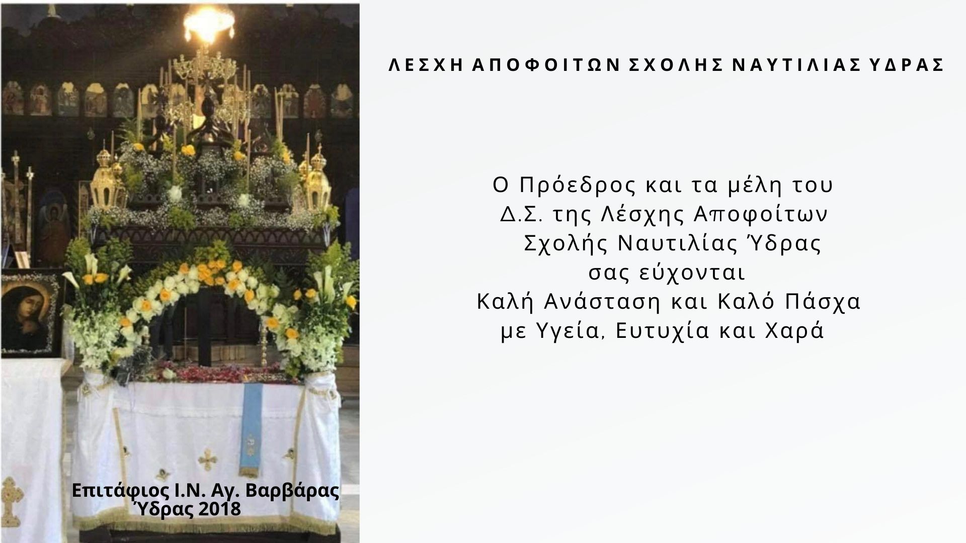Ο Πρόεδρος και τα μέλη του Δ.Σ. της Λέσχης Αποφοίτων Σχολής Ναυτιλίας Ύδρας, σας εύχονται Καλή Ανάσταση και Καλό Πάσχα με Υγεία, Ευτυχία και Χαρά.