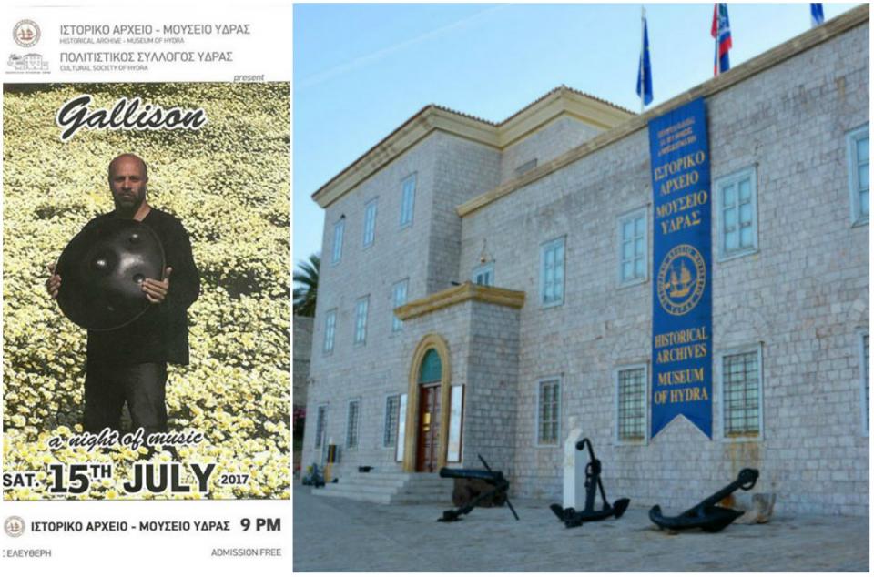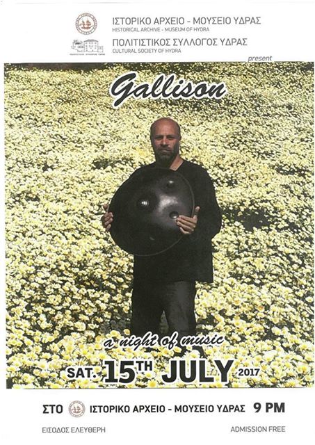 Το Ιστορικό Αρχείο - Μουσείο Ύδρας και ο Πολιτιστικός Σύλλογος Ύδρας οργανώνουν ένα μοναδικό HANDPAN κονσέρτο, "A NIGHT OF MUSIC", από τον GALLISON, το Σάββατο 15 Ιουλίου 2017 και ώρα 9 μ.μ. στην ταράτσα του ΙΑΜΥ.
