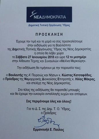 To Σάββατο 27 Ιανουαρίου 2018 στις 12 το μεσημέρι θα πραγματοποιηθεί η εκδήλωση κοπής πίτας της Δημοτικής Τοπικής Οργάνωσης Ύδρας της Νέας Δημοκρατίας στην Αίθουσα Τέχνης και Συναυλιών «Μελίνα Μερκούρη».