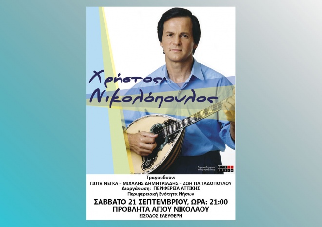 • Το Σάββατο 21 Σεπτεμβρίου, διοργανώνει στην παραλία της Αίγινας μουσική εκδήλωση με το κορυφαίο καλλιτεχνικό σχήμα του Χρήστου Νικολόπουλου, τη Γιώτα Νέγκα, το Μιχάλη Δημητριάδη και τη Ζωή Παπαδοπούλου.