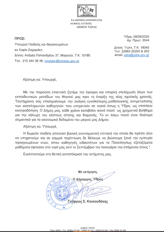 Ο Δήμαρχος Ύδρας, Γεώργιος Ε. Κουκουδάκης, με επιστολή του προς την Υπουργό Παιδείας και Θρησκευμάτων Σοφία Ζαχαράκη, ζητά την άμεση και επαρκή στελέχωση όλων των εκπαιδευτικών μονάδων του νησιού πριν την έναρξη της νέας σχολικής χρονιάς.