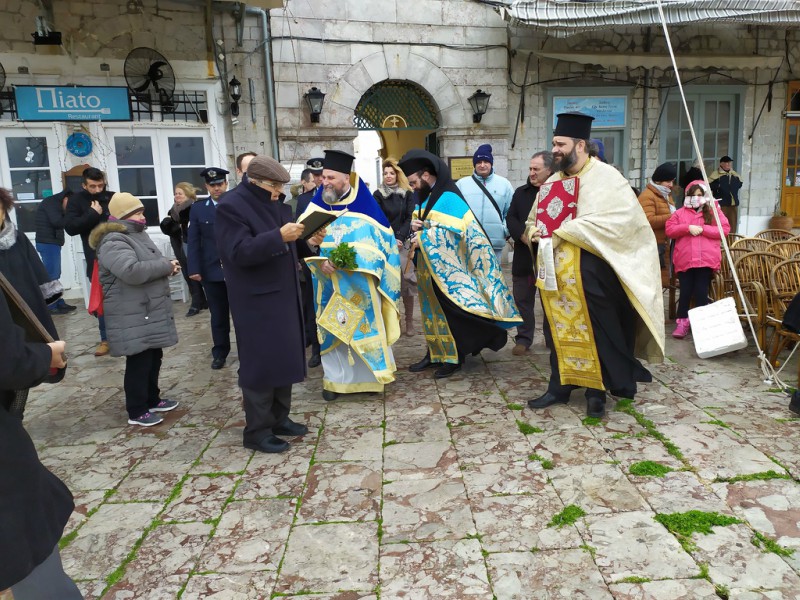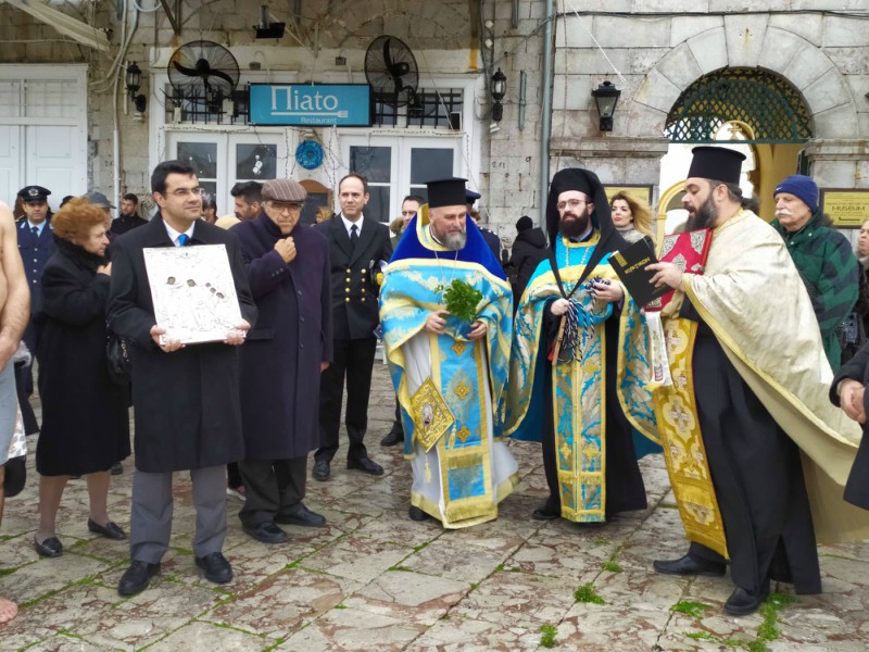Έξω από τον Ι. Καθεδρικό Ναό και με τα κύματα να καλύπτουν σε πολλά σημεία την παραλία, έγινε η κατάδυση του τιμίου σταυρού, που έριξαν στη θάλασσα με γενναιότητα παρά το ψύχος, ο Γ.Α.Ε. Πρωτ. Ακίνδυνος Δαρδανός και ο Αρχιμανδρίτης π. Θεόδωρος Θεοδοσίου, για να βουτήξει στα παγωμένα νερά ο συμπολίτης μας Παναγιώτης Ασημακόπουλος, όπου και τον ανέσυρε, λαμβάνοντας ως ευλογία επιστήθιο σταυρό από το Κοινωφελές Ίδρυμα Στυλιανού και Μαρίας Βέτιμη.