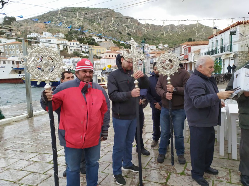 Παρά τις αντίξοες συνθήκες που δεν επέτρεψαν τον αγιασμό των υδάτων στα Καλά Πηγάδια και το Καμίνι, τηρήθηκε το έθιμο της κατάδυσης του τιμίου σταυρού στο λιμάνι της Ύδρας.