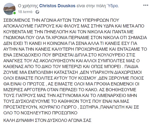 "Σεβόμενος την αγωνία αυτών των υπερηρώων που αποκαλούμε γιατρούς και φίλους μας στην Ύδρα και μετά από κουβέντα με την Πηνελόπη και τον Νικόλα και πάντα με γνώμονα, που όλα τα χρόνια περνάμε στον Νικόλα, ότι σημασία δεν έχει τι κάνει η κοινωνία για σένα αλλά τι κάνεις εσύ γι' αυτήν να την κάνεις καλύτερη, προχωρήσαμε και εντάξαμε το ένα ξενοδοχείο που βρίσκεται δίπλα στο Κουλούρειο στις ανάγκες του. Ας ακολουθήσουν και άλλοι συμπολίτες μας, ο καθένας από το δικό του μετερίζι και όπως μπορεί.