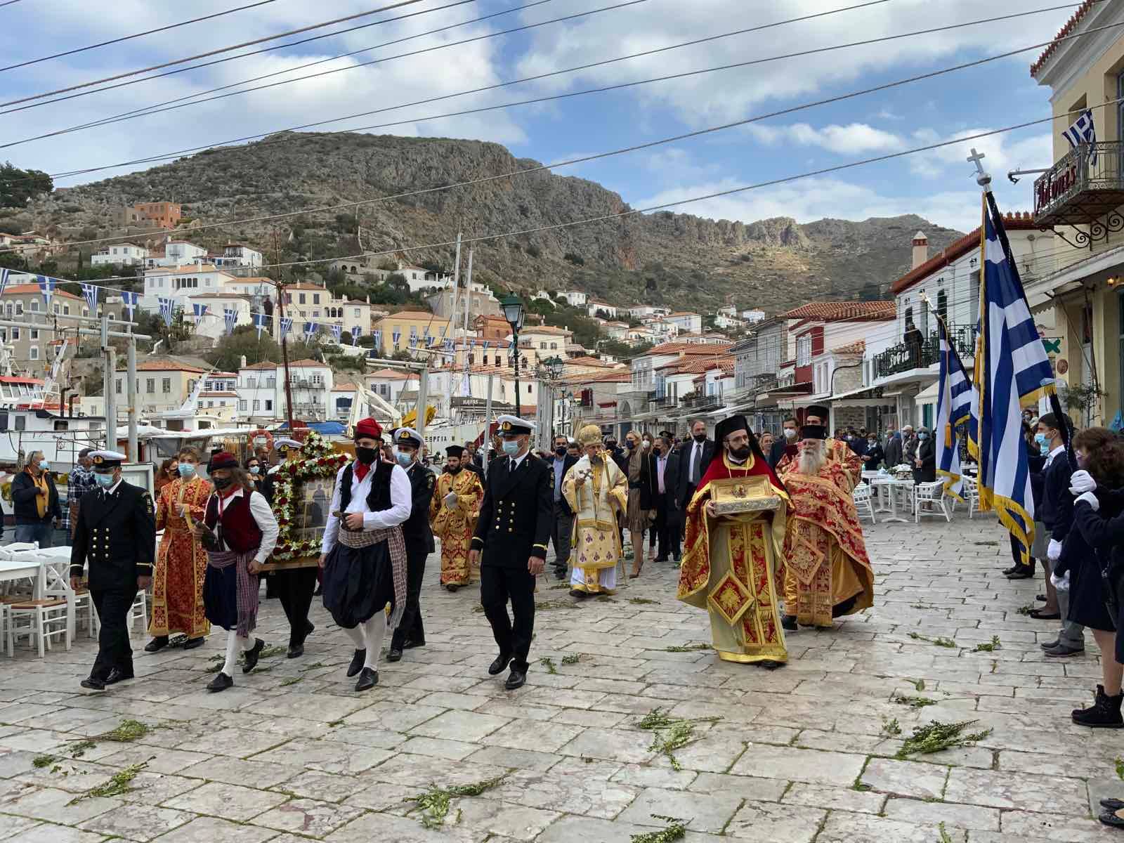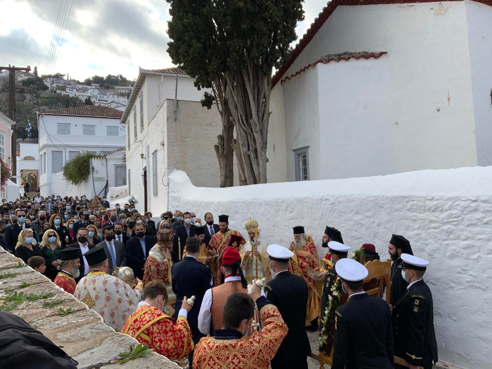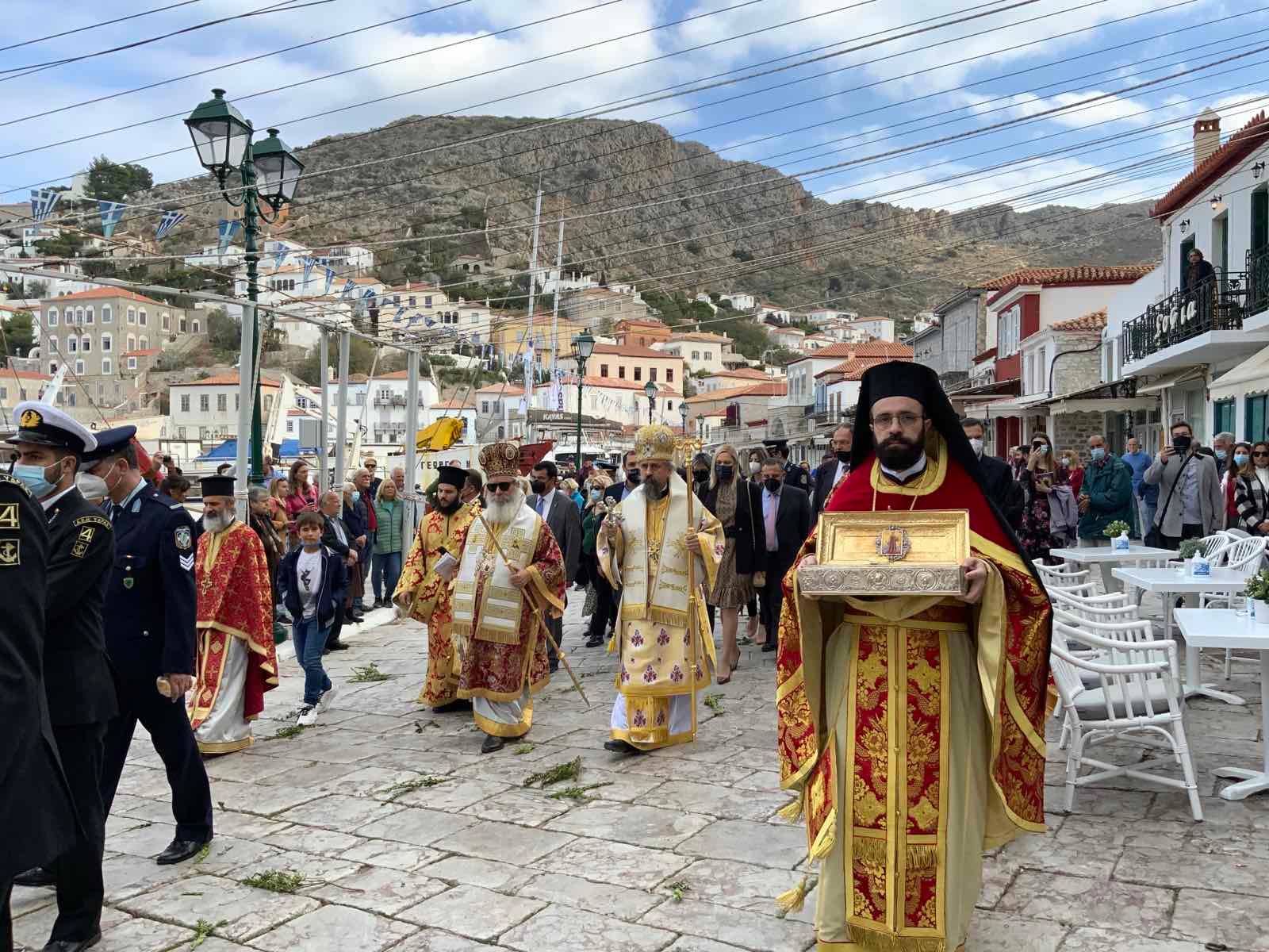 Επί της εξέδρας ο Σεβασμιώτατος Ποιμενάρχης μας κ. ΕΦΡΑΙΜ ευχαρίστησε τις αρχές κυρίως δε τα παιδιά των Σχολείων της Ύδρας εις τα οποία μίλησε πατρικά.