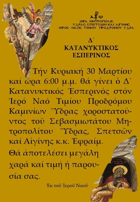 Ο Σεβασμιώτατος Ποιμενάρχης μας θα ομιλήσει την Δ ‘ ΚΥΡΙΑΚΗ ΤΩΝ ΝΗΣΤΕΙΩΝ,  30 Μαρτίου στον Τίμιο Πρόδρομο Καμινίων Ύδρας στις 18:00.