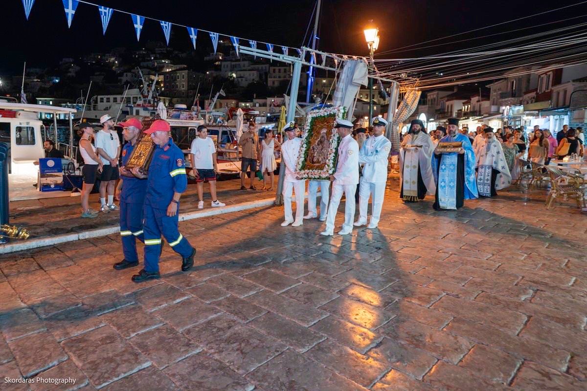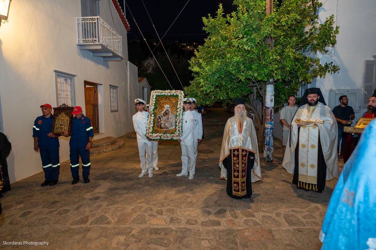 Κατά τη διάρκεια του Πανηγυρικού Εσπερινού, λιτανεύθηκαν οι Ιερές Εικόνες της Παναγίας, η Φανερωμένη και η επιλεγομένη του "Μαλίκη", παρουσία πλήθους πιστών, Υδραίων και επισκεπτών.