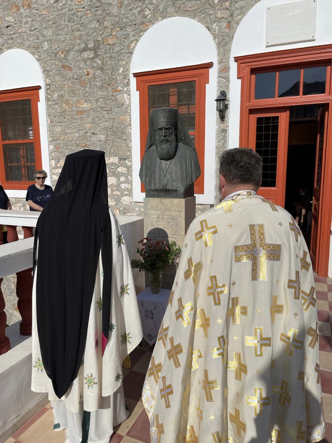 Μετά το πέρας της Θείας Λειτουργίας εψάλλει Τρισάγιο εις την προτομή του αοιδίμου Γέροντος Μητροπολίτου Ύδρας Κυρού ΙΕΡΟΘΕΟΥ, κτίτορος και πρώτου Προέδρου του Δ.Σ του Κουλουρείου Νοσοκομείου.