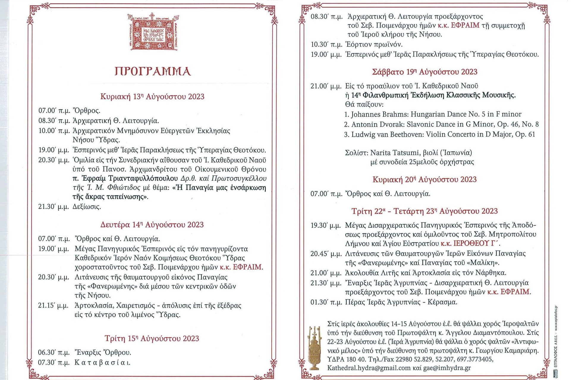 Οι εορταστικές εκδηλώσεις "ΘΕΟΜΗΤΟΡΙΚΑ" έχουν καθιερωθεί και με αυτές τιμώνται στην Ύδρα στον Ιερό Καθεδρικό Ναό Κοιμήσεως Θεοτόκου, τα γεγονότα του βίου της Παναγίας. Π Ρ Ο Γ Ρ Α Μ Μ Α