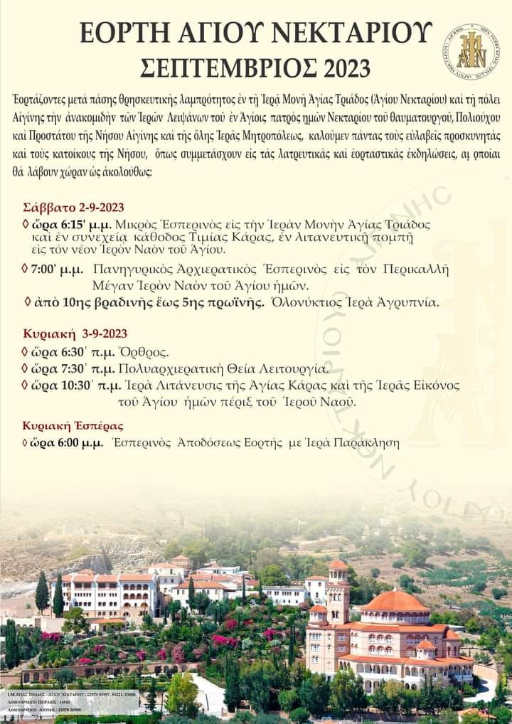 Ανακοινώθηκε από το Γραφείο Τύπου της Ιεράς Μητρόπολης Ύδρας, Σπετσών και Αιγίνης το Πρόγραμμα της Ιεράς Πανηγύρεως της ανακομιδής των τιμίων λειψάνων του Αγίου Νεκταρίου Αιγίνης (2 - 3 Σεπτεμβρίου).
