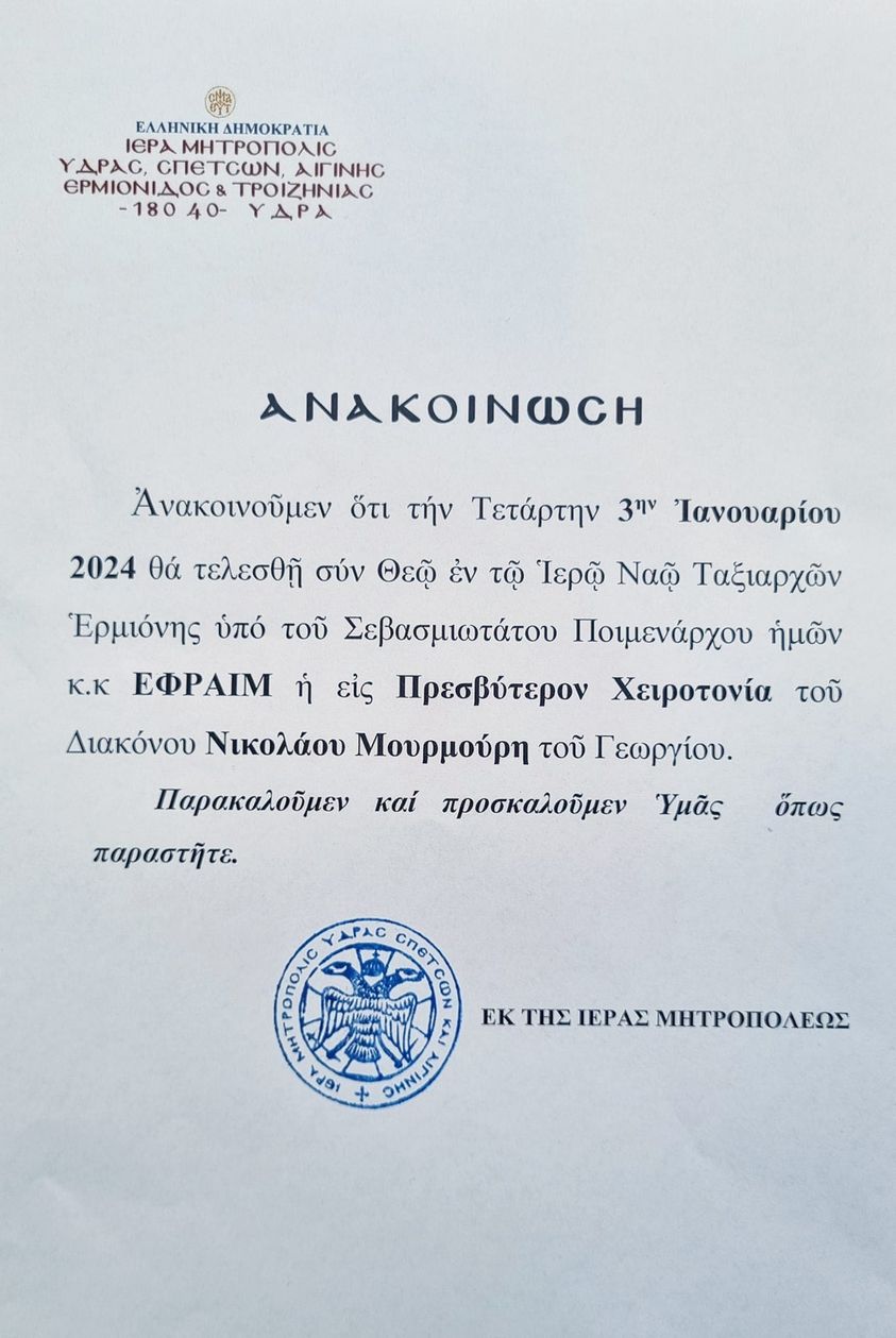 ΧΕΙΡΟΤΟΝΙΑ ΠΡΕΣΒΥΤΕΡΟΥ ΣΤΗΝ ΕΡΜΙΟΝΗ ΥΠΟ ΤΩΝ ΣΕΠΤΩΝ ΧΕΙΡΩΝ ΤΟΥ ΣΕΒΑΣΜΙΩΤΑΤΟΥ ΠΟΙΜΕΝΑΡΧΟΥ ΗΜΏΝ Κ.Κ ΕΦΡΑΙΜ.
