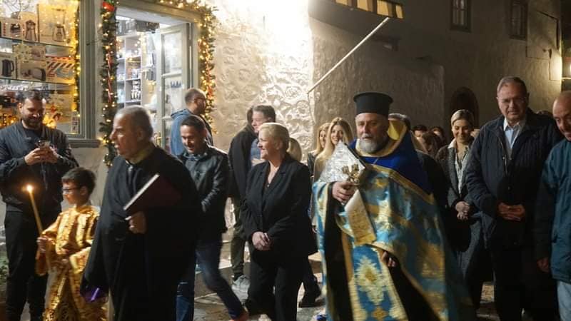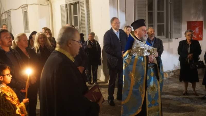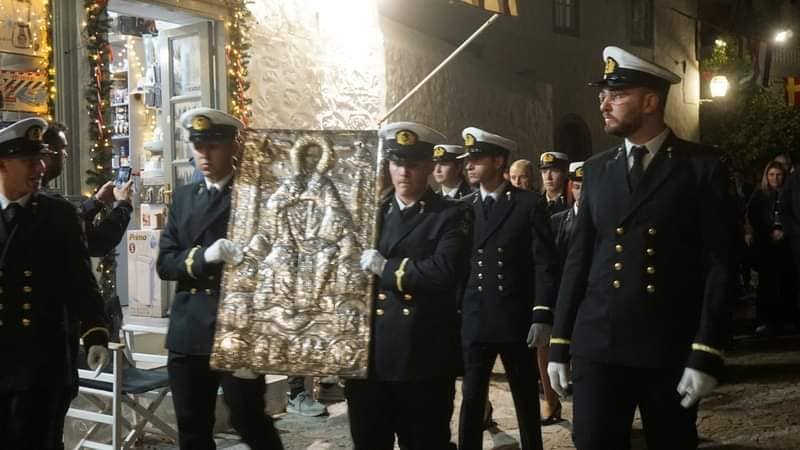 Ακολούθησε λιτάνευση της Ιεράς Εικόνος του Αγίου με την συμμετοχή των σπουδαστών και σπουδαστριών της Ακαδημίας Εμπορικού Ναυτικού, των αρχών της Νήσου και των πιστών.
