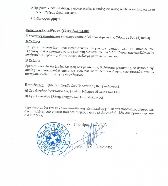 Στο πλαίσιο της ουσιαστικής μέριμνας του Δ.Λ.Τ.Ύδρας για την προστασία του θαλάσσιου περιβάλλοντος έχει προγραμματιστεί ετήσια εκπαίδευση της εθελοντικής ομάδας αντιμετώπισης της θαλάσσιας ρύπανσης που έχει συσταθεί για τον σκοπό αυτό, την Πέμπτη 30 Νοεμβρίου 2023 σε συνεργασία με το Λιμεναρχείο Ύδρας και την εξειδικευμένη εταιρεία σε αυτά τα θέματα ΜΕΤΟΠΗ Σύμβουλοι Προστασίας Περιβάλλοντος.