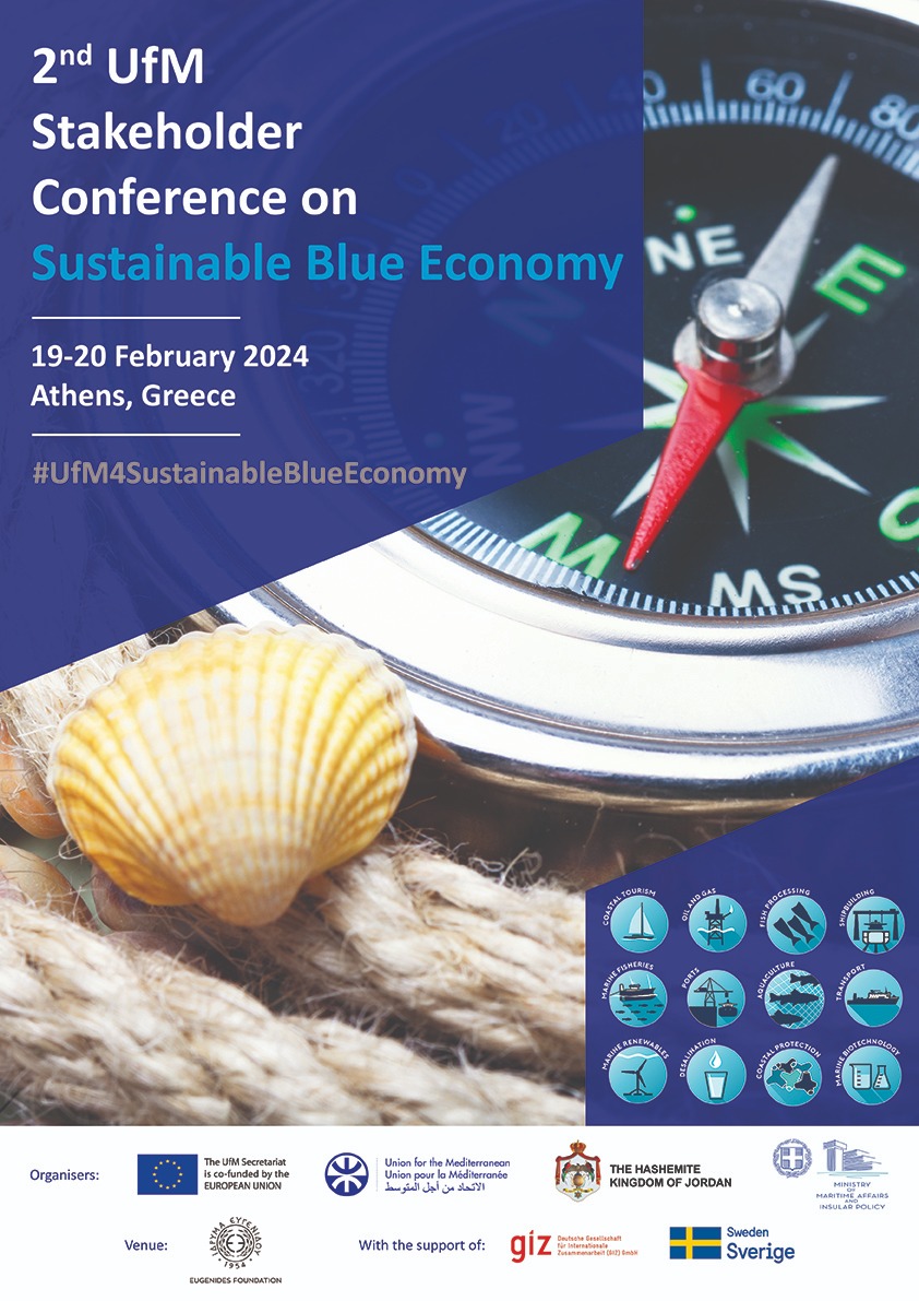 Ο Διακυβερνητικός Οργανισμός «Ένωση για τη Μεσόγειο (Union for the Mediterranean - UfM)» και η Γενική Διεύθυνση Θαλάσσιων Υποθέσεων και Αλιείας (DG MARE) της Ευρωπαϊκής Επιτροπής, σε συνεργασία με το Υπουργείο Ναυτιλίας και Νησιωτικής Πολιτικής και τη Γενική Γραμματεία Αιγαίου και Νησιωτικής Πολιτικής, διοργανώνουν το 2ο Συνέδριο Ενδιαφερομένων Φορέων στη Βιώσιμη Γαλάζια Οικονομία (2nd Stakeholder Conference on Sustainable Blue Economy) στις 19-21 Φεβρουαρίου 2024, στο Ίδρυμα Ευγενίδου (Λεωφ. Συγγρού 387, Π. Φάληρο, Αθήνα) έπειτα από επιστολή εκδήλωσης ενδιαφέροντος από την πλευρά της Ελλάδας.