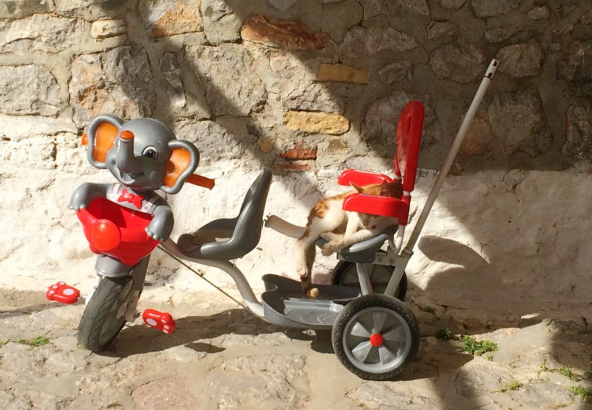 Είναι μια φωτογραφία αλλιώτικη, την οποία μας περιγράφει η Ελευθερία Μαστρογιάννη που έκανε τη λήψη της: "Όταν η πόλη ξυπνάει οι έξυπνες γάτες κοιμούνται. Και πού αλλού θα μπορούσαν να βρουν ησυχία; Μα φυσικά στα πιο απίθανα μέρη... Όπως αυτή η γλυκιά γατούλα βρήκε τη θέση της πάνω σε αυτό το παιδικό ποδήλατο. Πρώτα πλένεται και μετά απολαμβάνει τον ύπνο της κάτω από τις ζεστές ακτίνες του ήλιου".