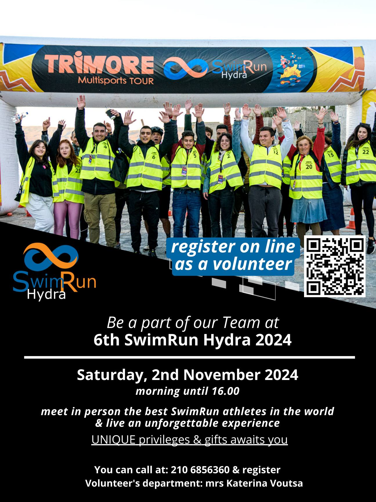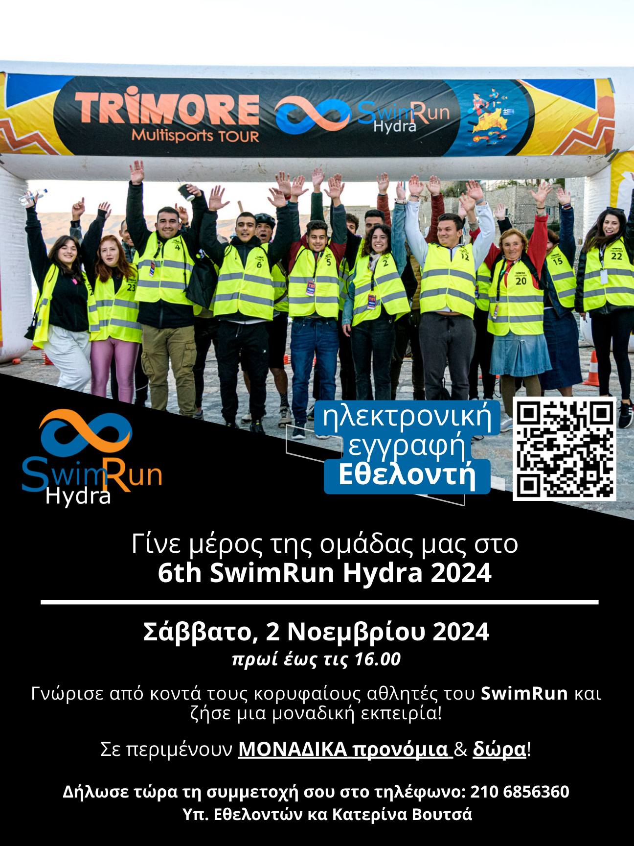Μπορείτε να δηλώσετε συμμετοχή ως εθελοντές, συμβάλλοντας στην οργάνωση του αγώνα και αποκομίζοντας μια ξεχωριστή εμπειρία. Για να εγγραφείτε, πατήστε στον σύνδεσμο παρακάτω https://trimore.gr/el/join-our-team ή μπορείτε να σκανάρετε με το κινητό σας το QR code στην αφίσα μας.