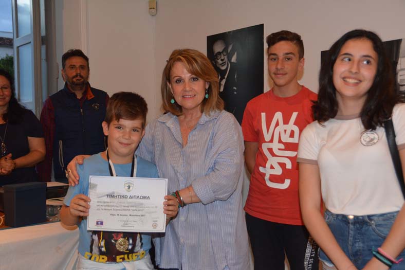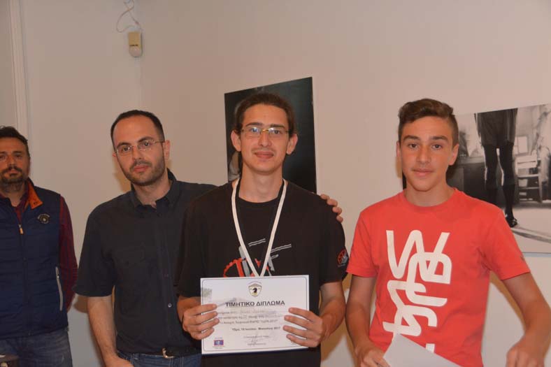 Η Διευθύντρια του ΙΑΜΥ, Ντίνα Αδαμοπούλου στους πρώτους Γενικής Κατάταξης Κ18, (1ος Λαύκας Ιωάννης, (ΑΟ. Κρανιδίου), 2ος Δαρδανός Εφραίμ, (Σκακιστικός Όμιλος Ύδρας), 3η Μπιχάκη Ουρανία, (Πειραικός ΟΣ).
