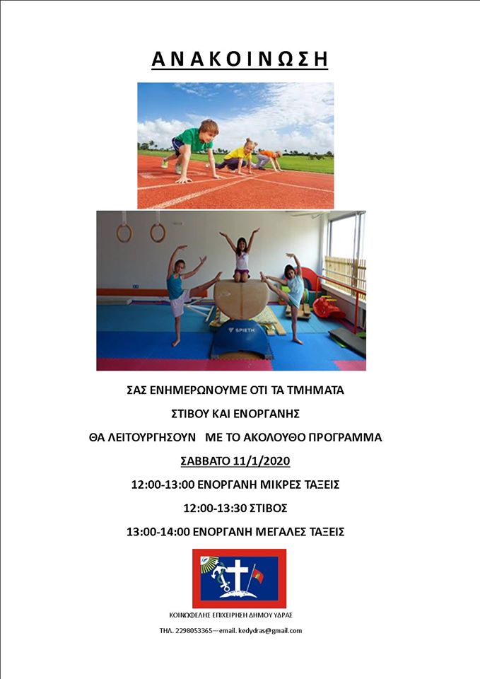 H Κοινωφελής Επιχείρηση Δήμου Ύδρας ενημερώνει ότι τα τμήματα στίβου και ενόργανης γυμναστικής θα λειτουργήσουν ως εξής: