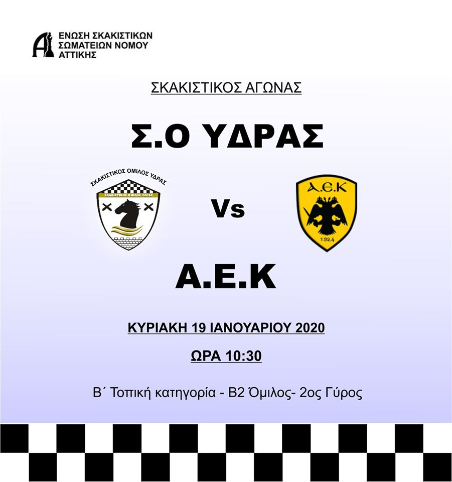 Την Κυριακή 19 Ιανουαρίου 2020 για τον 2ο γύρο του Διασυλλογικού πρωταθλήματος της Ε.Σ.Σ.Ν. Αττικής, η ομάδα του Σκακιστικού Ομίλου Ύδρας θα υποδεχθεί την ισχυρή ομάδα της Α.Ε.Κ