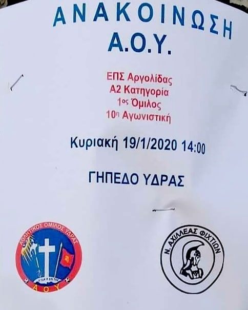 Η ομάδα του Αθλητικού Ομίλου Ύδρας υποδέχεται τον Ν. Αχιλλέα Φιχτίων για την 10η αγωνιστική την Κυριακή 19 Ιανουαρίου στις 2 το μεσημέρι στο γήπεδο της Ύδρας.