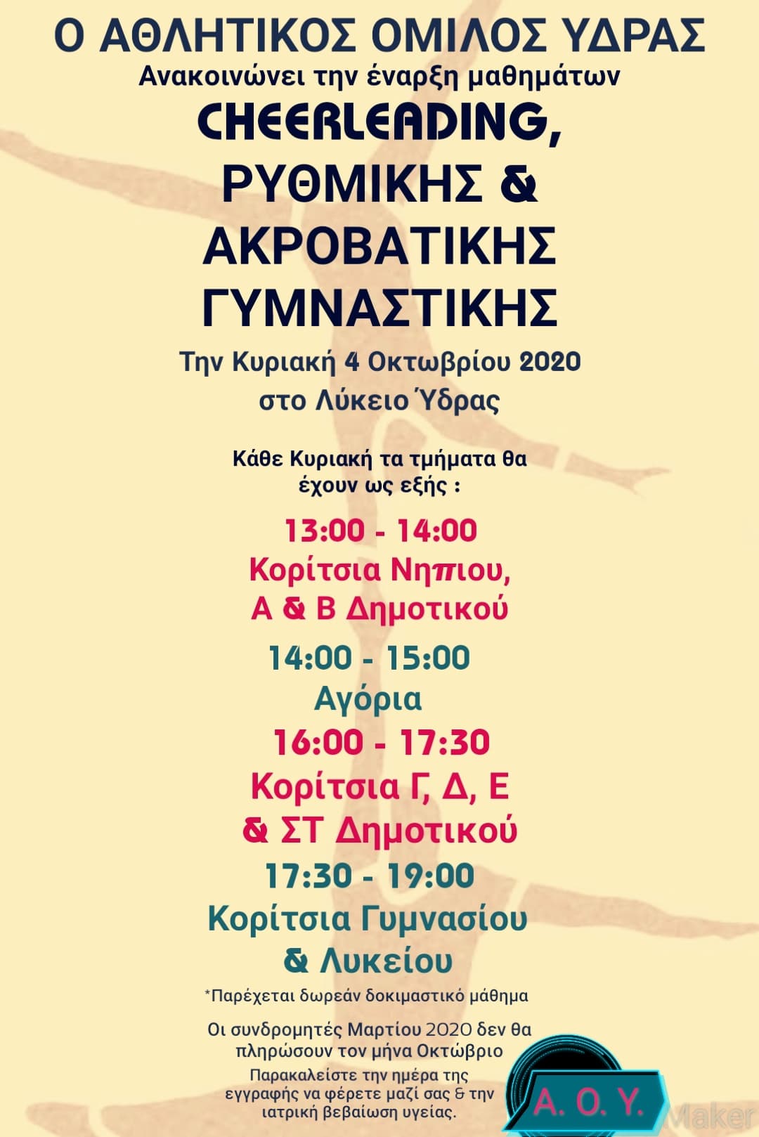 Στις 4 Οκτωβρίου στο Λύκειο, o Aθλητικός Όμιλος Ύδρας ξεκινά για δεύτερη χρονιά τα μαθήματα Cheerleading, Ρυθμικής και Ακροβατικής Γυμναστικής.