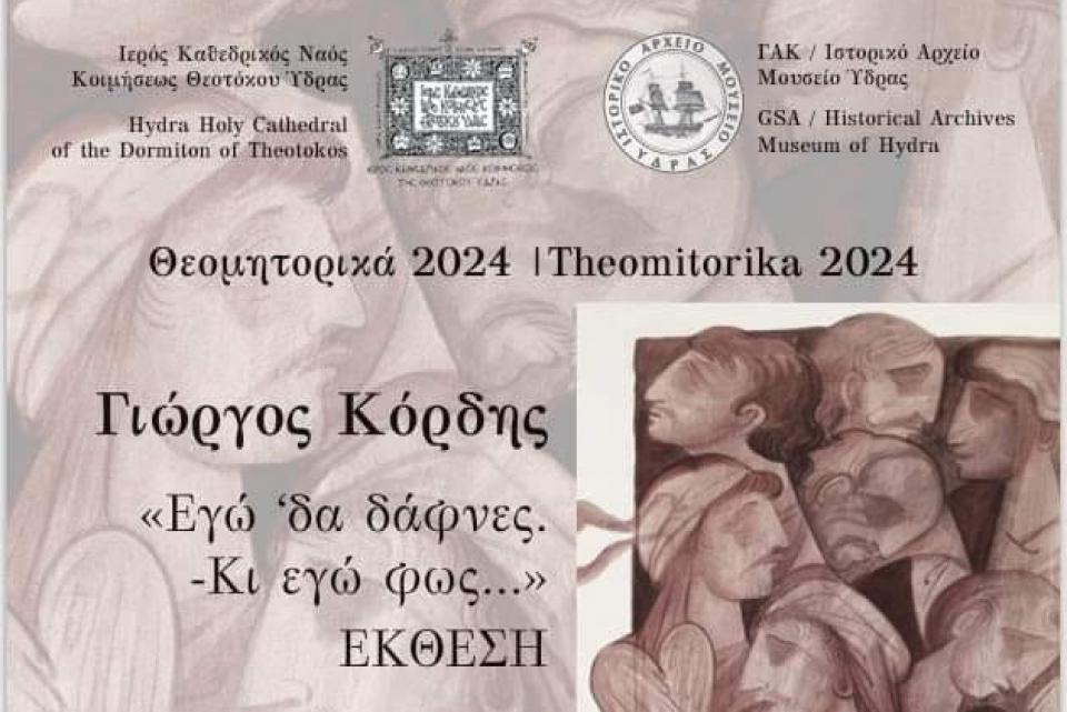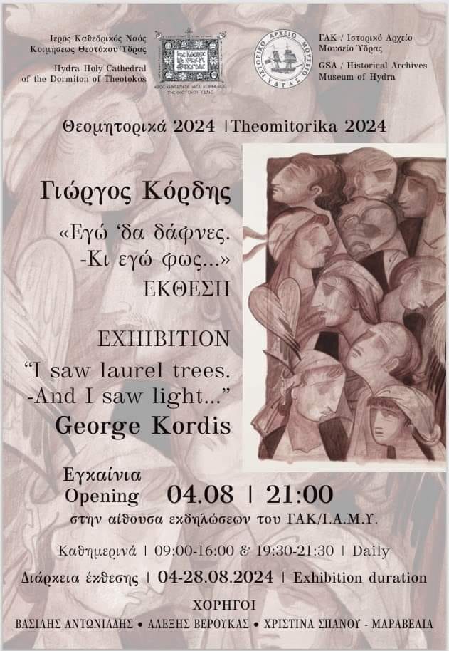 Την Κυριακή 4 Αυγούστου 2024 στις 9 το βράδυ θα πραγματοποιηθούν στην αίθουσα πολιτιστικών εκδηλώσεων του ΓΑΚ/Ιστορικού Αρχείου-Μουσείου Ύδρας τα εγκαίνια της Έκθεσης Αγιογραφίας του περίφημου ζωγράφου-αγιογράφου Γιώργου Κόρδη με τίτλο: «Εγω δά δάφνες.- Κι εγω φως…» από τους Νεομάρτυρες στους «ελεύθερους πολιορκημένους».
