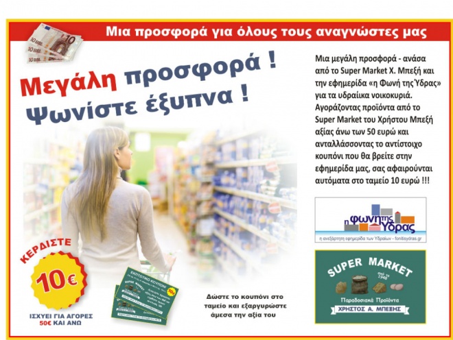 Μια μεγάλη προσφορά ξεκινά στο τεύχος Δεκεμβρίου από το Super Market του Χρήστου Μπεξή και τη «Φωνή της Ύδρας». Το Super Market του Χρήστου Μπεξή ανταποκρινόμενο στην προτίμηση των καταναλωτών και γνωρίζοντας τις δύσκολες οικονομικές συγκυρίες, προσφέρει δύο εκπτωτικά κουπόνια των 10 ευρώ σε όλους τους αναγνώστες της «Φωνής της Ύδρας» για τις εορταστικές τους αγορές.