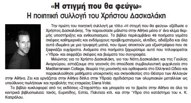 Την πρώτη του ποιητική συλλογή με τίτλο «Η στιγμή που θα φεύγω» εξέδωσε ο Χρήστος Δασκαλάκης. Την παρουσίασε μάλιστα στην Αθήνα μέσα σ' ένα κλίμα θερμής υποστήριξης και ενθουσιασμού.
