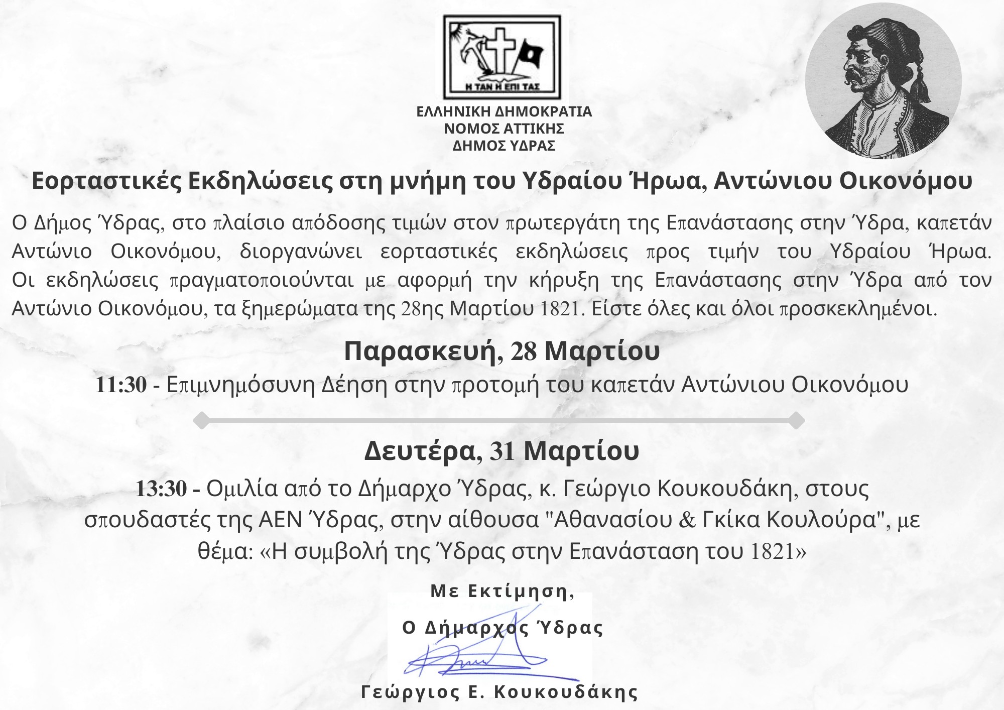 Ο Δήμος Ύδρας, στο πλαίσιο απόδοσης τιμών στον πρωτεργάτη της Επανάστασης στην Ύδρα, καπετάν Αντώνιο Οικονόμου, διοργανώνει εορταστικές εκδηλώσεις προς τιμήν του Υδραίου Ήρωα.