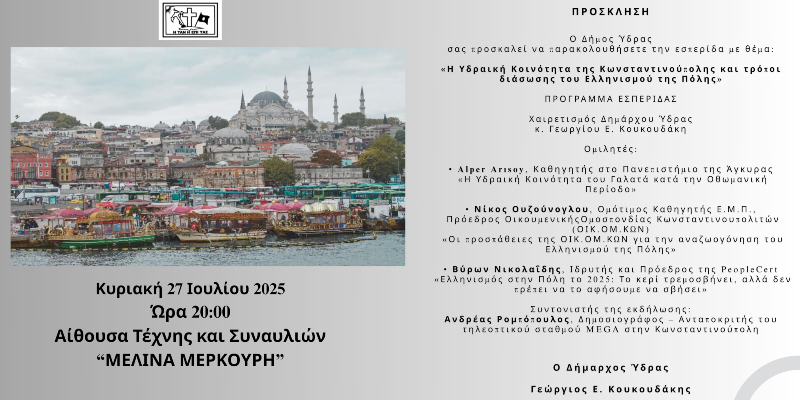 Το θέμα της εσπερίδας είναι: «Η Υδραϊκή Κοινότητα της Κωνσταντινούπολης και τρόποι διάσωσης του Ελληνισμού της Πόλης»
