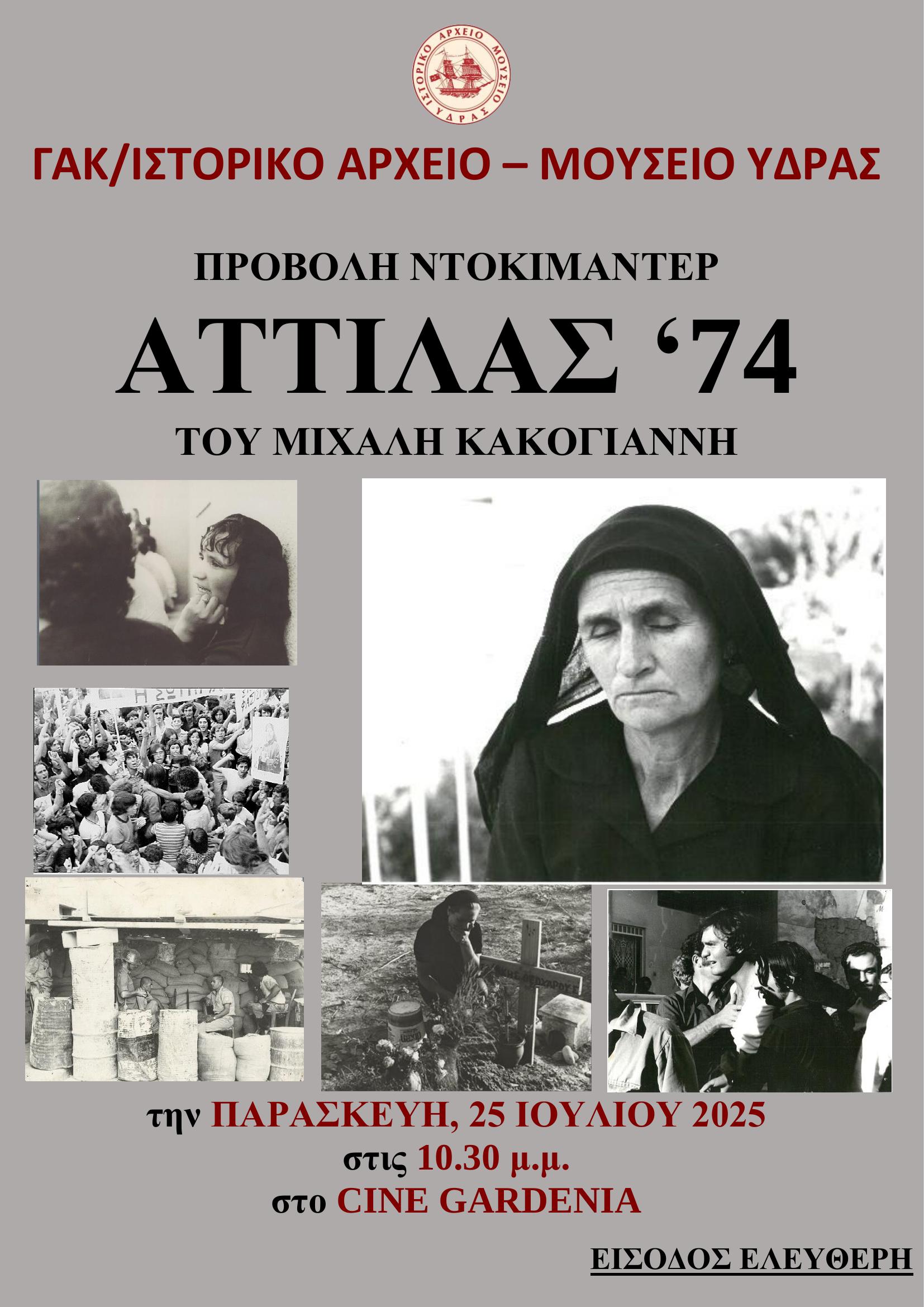 Το ΓΑΚ/ΙΣΤΟΡΙΚΟ ΑΡΧΕΙΟ - ΜΟΥΣΕΙΟ ΥΔΡΑΣ προσκαλεί στην προβολή ντοκιμαντέρ με τίτλο "ΑΤΤΙΛΑΣ '74" του Μιχάλη Κακογιάννη την Παρασκευή, 25 Ιουλίου 2025 στις 10.30 μ.μ.