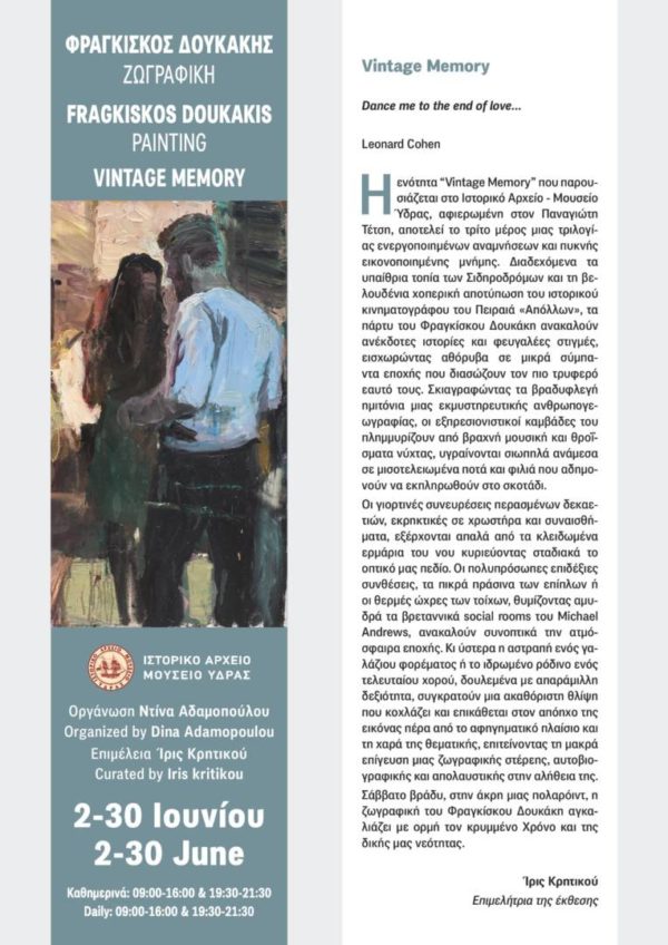Η ενότητα “Vintage Memory” του Φραγκίσκου Δουκάκη που θα παρουσιάστει στο Ιστορικό Αρχείο-Μουσείο Ύδρας και είναι αφιερωμένη στον Παναγιώτη Τέτση, αποτελεί το τρίτο μέρος της τριλογίας ενεργοποιημένων αναμνήσεων και πυκνής εικονοποιημένης μνήμης.