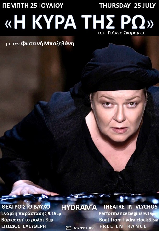 Tην Πέμπτη, 25 Ιουλίου, η καταξιωμένη ηθοποιός ΦΩΤΕΙΝΗ ΜΠΑΞΕΒΆΝΗ θα ενσαρκώσει την «Κυρά της Ρω», στο ομώνυμο θεατρικό έργο του Γιάννη Σκαραγκά στο Hydrama Theatre στον Βλυχό. Μέσα από ένα τρυφερό και ποιητικό πορτρέτο μιας ελεύθερης γυναίκας, όπου οι καθημερινές αγωνίες αντιμετωπίζουν τα στοιχεία της φύσης, η παράσταση μας ταξιδεύει από την μοναξιά στην ελπίδα. Σκηνοθετεί η Κατερίνα Μπερδέκα και συμμετέχει και ένας τσελίστας στην παράσταση.