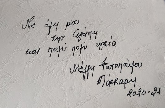 Λάβαμε την υπέροχη κάρτα της, ζωγραφισμένη με πολλή αγάπη από την ίδια, με την οποία μας δένει οικογενειακή φιλία και εκτίμηση πολλών ετών.
