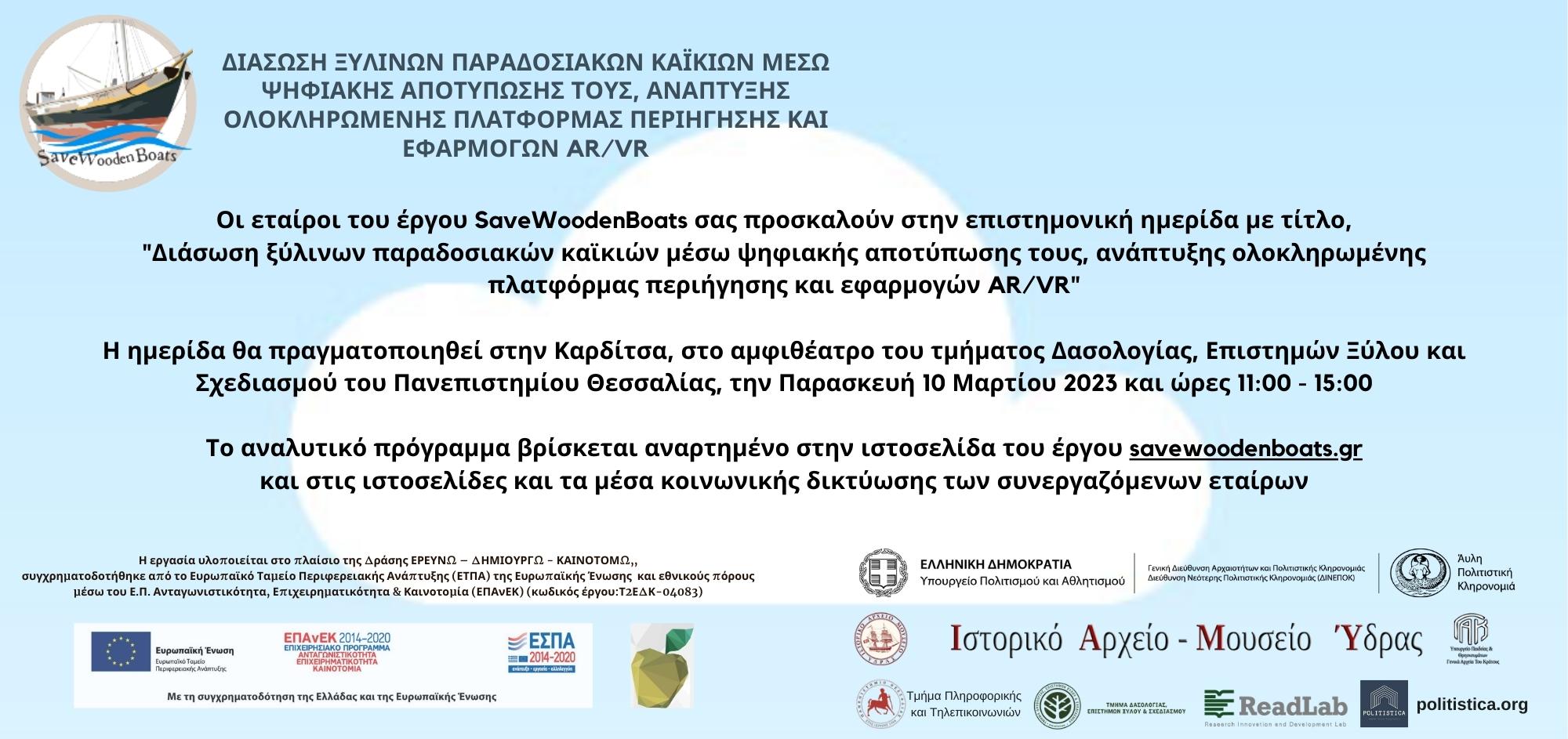 Επιστημονική ημερίδα του έργου SaveWoodenBoats διοργανώνεται με τίτλο: "Διάσωση ξύλινων παραδοσιακών καϊκιών μέσω ψηφιακής αποτύπωσης τους, ανάπτυξης ολοκληρωμένης πλατφόρμας περιήγησης και εφαρμογών AR/VR".