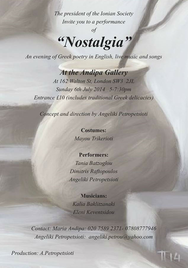 Mια εξαιρετική βραδιά δραματοποιημένης ποίησης στο Λονδίνο και στην Andipa Gallery θα παρουσιάσει η Υδραία Ηθοποιός Αγγελική Πετροπετσιώτη στις 6 Ιουλίου. Πρόκειται για την performance "Nostalgia" με ελληνική ποίηση μεταφρασμένη στα αγγλικά, «παντρεμένη» με την παραδοσιακή μουσική και το τραγούδι, με θέμα την μετανάστευση των Ελλήνων. Το κατά πόσο δηλαδή όσοι φεύγουν, κόβουν τους δεσμούς τους, τους ομφάλιους λώρους με την Ελλάδα και τι παίρνουν μαζί τους αλλά και πόσα πισωγυρίσματα κάνουν πριν την τελική φυγή. Πόσο τους πληγώνει η κατάσταση που επικρατεί στην Ελλάδα; Τι αφήνουν πίσω;