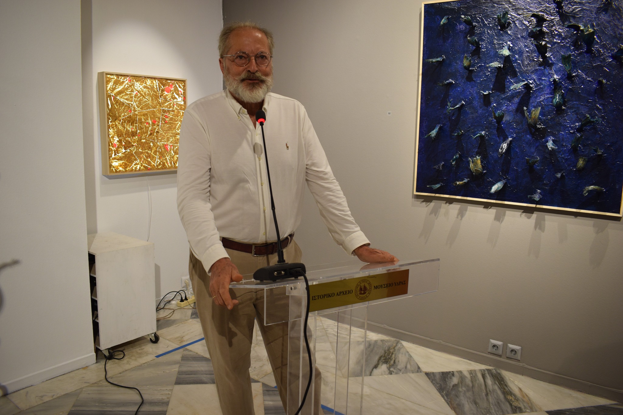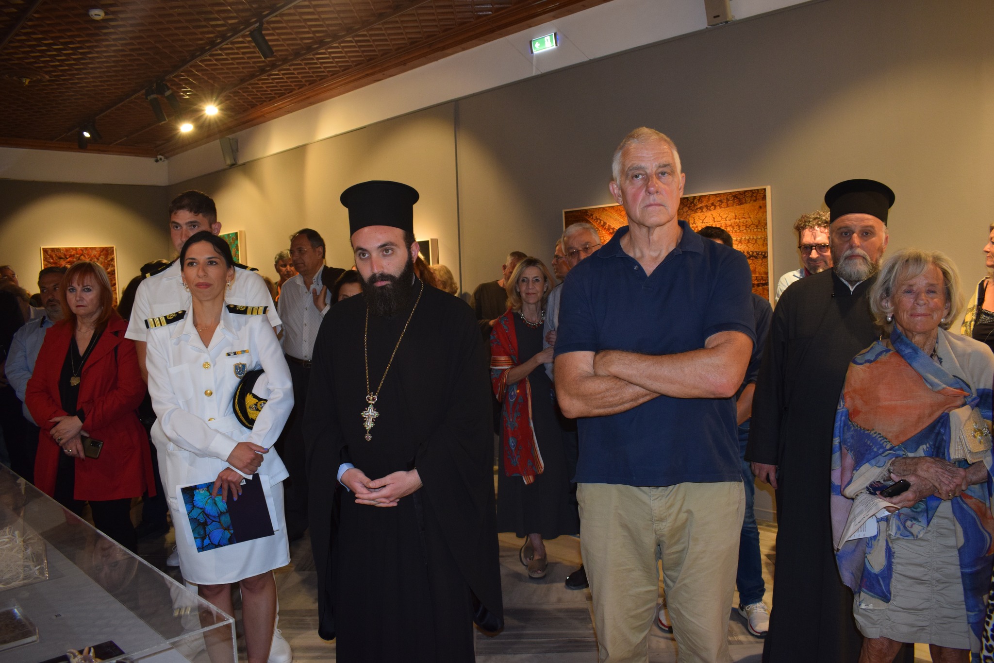 Στη συνέχεια έδωσε τον λόγο στον εκπρόσωπο του Μητροπολίτη Ύδρας, Πρωτοσύγκελλο Αρχιμανδρίτη π. Νεκτάριο Δαρδανό, ο οποίος αναφέρθηκε πολύ επαινετικά στον καλλιτέχνη και μετέφερε τις ευχές του Μητροπολίτη για καλή επιτυχία στην Έκθεση και ακολούθως στον Δήμαρχο Ύδρας Γιώργο Κουκουδάκη ο οποίος εξήρε επίσης το έργο του καλλιτέχνη αναφερόμενος παράλληλα στην πολιτιστική προσφορά του ΙΑΜΥ.